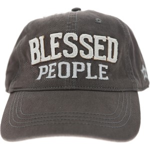One-Size-Fits-Most dark gray baseball cap hat. Made from 100% cotton and features weatherproof & rust-proof hardware. The small holes in the top of each hat section make it more breathable. In addition, the brim can be bent to the desired arch. Snap with an adjustable strap that can be tucked away into the backside hat. Features a "Blessed" white sentiment sewn in with a frayed rustic look edging. "People" is embroidered below. In addition, a "WP" star-shaped logo is sewn into the side of the hat. Finally, a round outlined "Blessed People" screen is printed with a triple cross pattern on the hat's bottom brim. Spot clean only; leave out in the sun to dry. It is packaged in a polybag with a plastic j hook and hangtag.