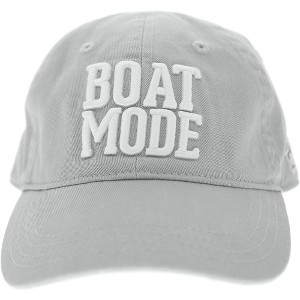 One-Size-Fits-Most beige gray baseball cap hat. Made from 100% cotton and features weatherproof & rust-proof hardware. The small holes in the top of each hat section make it more breathable. In addition, the brim can be bent to the desired arch. Snap with an adjustable strap that can be tucked away into the backside hat. The front of the hat features a 3d white embroidered patch "Boat Mode" sentiment. The underside brim of the cap has a screen printed "Meant For The Boat" sentiment accompanied by an anchor in white. Spot clean only; leave out in the sun to dry. It is packaged in a polybag with a plastic j hook and hangtag. The lake, beach, and boat are beautiful getaways to soak up the sun, ride the boat, sit next to the fire, and create summertime memories that will last a lifetime. So give your lake, beach, or boat lover friend the best apparel to wear/sport all summer.