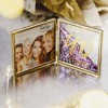 - PREMIUM QUALITY: 4.75" double-sided hinged frame, packaged in a plain box, is made from glass and metal, features glitter that moves around within the frame, and fits a 4.5x4.5" photo. This self-standing frame extends to almost a 180-degree angle to ensure solid support. Gold text printed on the glass matches the frame color. Pink, blue, purple, and silver glitter in various sizes match the festive tone. Frame folds in half neatly for easy storage and transport. Two removable foam inserts securely hold the photo frame backing in place and make for easy and insertion and removal of pictures. Frame fits your favorite square photo!