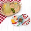 The 13.75” long x 9” wide x 1” deep glassware three-sectioned chip and dip tray has a 7.5" tall x 4" wide center dip holder and each of the sides is about 5" wide. The top is glossy, and the bottom is matte. The left section has some large cherries and blue polka dots above and below on a white background. The center section has a blue background with greenery leaves and blue polka dots. The right section has a combination of greenery, polka dots, and small/medium-sized cherries on a white background. Dishwasher safe. Handwashing is recommended to preserve decals. Packaged in a printed-patterned box that cheerfully displays the pattern on the duble kitchenware. Wonderful for a vintage-style, cherry-themed, or red kitchen. This summertime feel will bring a bright pop of color to the home. Cherry lovers will be thrilled to add this unique piece to their collection.