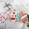 - IN-HOUSE DESIGN: The left section has some large cherries and blue polka dots above and below on a white background. The center section has a blue background with greenery leaves and blue polka dots. The right section has a combination of greenery, polka dots, and small/medium-sized cherries on a white background.