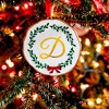 Organic-shaped 4" round porcelain ornament has a removable red velvet ribbon for hanging. Packaged in a holiday striped background, an acetate-covered cardboard box with a gold bow-tie stretchy ribbon makes this a beautiful gift for the holiday season. Christmas holly with red ribbon and the letter "D" is heat-stamped and embossed. The sentiment card says, "Wishing you and yours joy & happiness this season.". Wipe with a damp cloth as needed. A beautiful piece to hang on the tree, mantel, or table during the holiday or Christmas season. Monogrammed ornaments will make a great present to family, friends, neighbors, and coworkers.