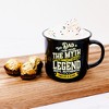 - IN-HOUSE DESIGN: "This Dad Is The Man, The Myth, The Legend, 100% Authentic, One Of A Kind" decal is in full caps, black and white, with multi-directional lines of words intertwined with yellow swirls and banners which stand out on the stark black exterior. The bright yellow interior has a black "Legends Of This World" logo on the interior only when the handle is facing to the right side only.