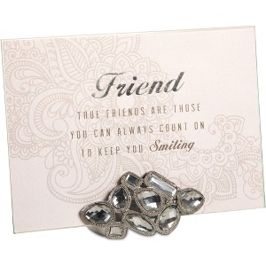 5" x 7" plaque with bejeweled stand, packaged in a printed box, is made from reinforced card and metal. "Friend; True Friends Are Those You Can Always Count On To Keep You Smiling" text and accompanying floral design are both printed onto the front of the plaque. Dust with a dry cloth, if necessary. Plaque can be replaced by a 5" x 7" photo. Great for gifting to a friend.