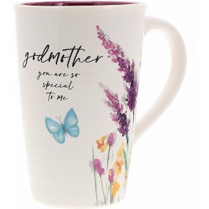 17 oz latte coffee cup mug is made from stoneware. A smooth-edged, easy-to-hold handle accompanies a ribbed exterior texture. The overall finish is a shiny gloss. Mug faces towards you in the right hand and away in the left. Beautiful springtime patterns. Purple & yellow floral pattern wrap around half of the mug from bottom to top with several blue butterflies. "Godmother You Are So Special To Me" sentiment is on the front side of the cup. The mug's interior is purple, whereas the exterior is creamy white. Microwave & dishwasher safe. It is packaged in a die-cut box. Godmothers are a special gift. Include their favorite hot cocoa, coffee, or tea for the best reminder of how truly loved & cherished they are. She'll adore this loving embrace for years to come.