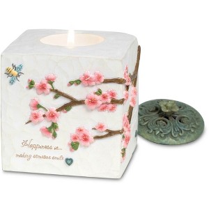 3.5" square candle holder, packaged in a printed box, is made from polyresin, features a metal lid, and fits a regular tealight candle (included). "Happiness Is Enjoying The Simple Things In Life; Happiness Is Knowing You Are Loved; Happiness Is Sharing Laughter With A Friend; Happiness Is Making Someone Smile" text is hand-painted onto the front of the candle holder, alongside cherry blossom and bee raised detailing. Wipe clean with a damp cloth. Always take care around an open flame. Great for gifting to a friend.