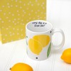 The 18 oz stoneware mug has a white background with a glossy interior and exterior. The simplistic and bold patterns stand out among any drinkware collection. . The wrap-around exterior design includes large-scale, brightly colored, vibrant, cheerful whole and sliced lemons, green leaves, and black polka dots. When the large, comfortable handle faces towards the right, the interior brim shows a handwritten styled "Every Day Is A Fresh Start" upbeat, happy, and encouraging sentiment. Dishwasher and microwave safe. It is packaged in a protective die-cut box for secure shipping. This is a beautiful present for lemon pickers and farmers. From baking to snacking to fragrances to cleaning to skin care, lemons have endless use possibilities for anyone who brightens their lives and adds the sweetest touch to each day. Bring freshness to every season of their lives.