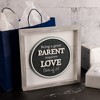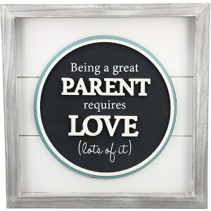 - IN-HOUSE DESIGN: Whitewashed pine rustic-style edges accompany a white shiplap backdrop, a gray circle, and light blue edging. "Being A Great Parent Requires Love (Lots Of It)" sentiment is printed on the raised gray center. "Parent" & "Love" are also embossed.