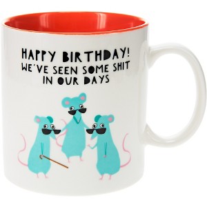 17oz mug, packaged in a plain box, is made from Prop 65 approved new bone china. "Happy Birthday; We've Seen Some In Our Days" text and accompanying mice decal are both printed onto the front of the mug. Dishwasher safe, although washing by hand is recommended to best preserve decals. Microwave safe. Great for gifting to a friend on their birthday.