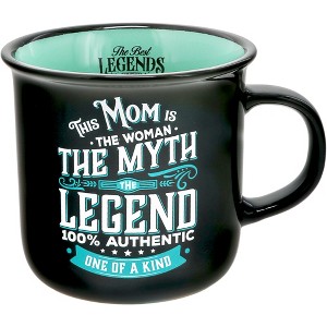 This 13 oz double-sided design mug features a comfortable handle, smooth straight walls, an easy-to-sip curved lip, an overall glossy finish, and bold pops of color on the interior and exterior of the drinkware. "This Mom Is The Woman, The Myth, The Legend, 100% Authentic, One Of A Kind" decal is in full caps, black and white, with multi-directional lines of words intertwined with seafoam green swirls and banners which stand out on the stark black exterior. The seafoam green interior has a black "Legends Of This World" logo on the interior only when the handle is facing to the right side only. Dishwasher and microwave safe. Prop 65 certified. Package in a protective die-cut box. A great unique present for Mother's day from husband to wife, son to mom, daughter to mom, or any motherly figure who deserves an encouraging special reminder message. As they sip their coffee, tea, hot chocolate, or other drink of choice, they'll think of you, even when you can't be by their side.