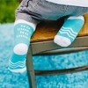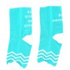 - IN-HOUSE DESIGN: "No shirt no shoes no problem" is sewn into the back side of each ankle/calf. The white wave-like stripes are on the sock's bottom, side, and front. The ankle, heel, and toe are white, while the main part of the sock is turquoise. The pair comes packaged in a plastic poly bag with a cardboard sleeve.