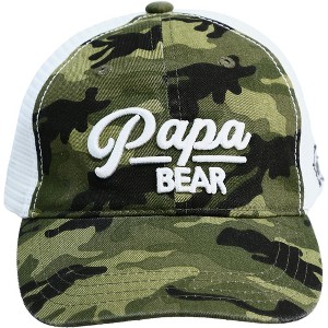 - IN-HOUSE DESIGN: Features a printed green camo patterned on the front and brim of the hat. The backing is white mesh and features a snap, along with an adjustable strap that can be tucked away. The front of the hat features a 3d embroidered patch "Papa Bear" text. Comes packaged in a polybag with a plastic j hook and hangtag.