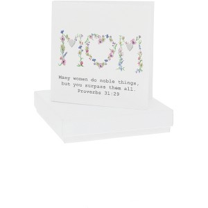 - IN-HOUSE DESIGN: The cheerful celebratory printed watercolored beautiful wildflower letter "Mom" design with the earrings strategically placed within the florals. The typewritten style gray "Many Women Do Noble Things, But You Surpass Them All. Proverbs 31:29" sentiment is placed below the celebratory printed format.