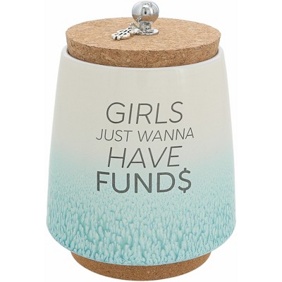 This incredible money-holding jar is 6.5" tall. The base of the stoneware vessel is 4.5" wide, tapering to 3.5" wide towards the top, where the cork lid narrows from top to bottom to fit snuggly inside the lip of the container. A 1.75" length metal chain holds a removable dog bone icon keychain that can be added to your keys or left connected to the .5" wide x .75" tall rounded metal ball handle. The base is made from cork to prevent surfaces from scratching and provides an easier grip to pick up the canister. The front side of the piggy bank has a simplistic "Puppy Fund" gray sentiment and an ombre glossy reactive dripped speckling glaze that fades from white at the top to teal at the bottom. The interior of the jar features fill lines accompanied by sentiments that are .75 inches from one another. The very bottom line "Not Enough Fund$" goes up to 1.5 inches from the base, followed by "Getting There," leading to "So Much Fund$" with "Fully Funded" at the top. . Avoid moisture from reaching the cork accents of the savings bank, as they may warp. Instead, wipe the stoneware part with a soft soap-damp cloth and dry immediately. Packaged in a protective die-cut box for safe delivery.