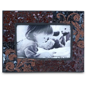 7.75" photo frame, packaged in a printed box, is made from glass and metal, features an easel stand for displaying, and fits a 4x6 photo. Features a metallic mosaic design. Wipe clean with a damp cloth. . Great for gifting to a friend.
