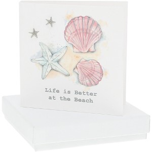 - IN-HOUSE DESIGN: The cheerful, celebratory printed watercolored starfish, seashells, sand, and water are designed with the earrings placed in the top left. The gray sentiment of the typewriter, "Life Is Better At The Beach," is placed in the bottom center.
