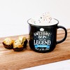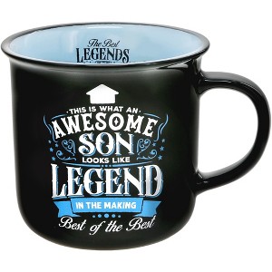 This 13 oz double-sided design mug features a comfortable handle, smooth straight walls, an easy-to-sip curved lip, an overall glossy finish, and bold pops of color on the interior and exterior of the drinkware. "This Is What An Awesome Son Looks Like. 100% Genuine, A Legend In The Making" decal is in full caps, black and white, with multi-directional lines of words intertwined with blue swirls and banners; a white arrow points up towards the drinker, which stands out on the stark black exterior. The blue interior has a black "Legends Of This World" logo on the interior only when the handle is facing to the right side only. Dishwasher and microwave safe. Prop 65 certified. Package in a protective die-cut box.