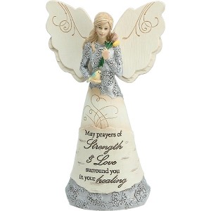6.5" angel figurine, packaged in a printed box, is made from polyresin. "May Prayers Of Strength & Love Surround You In Your Healing" text is debossed and painted onto the front of the angel, alongside an intricate silver design, bird, and flowers. Dust with a dry cloth. Great for gifting to a friend.