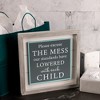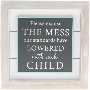 - IN-HOUSE DESIGN: Whitewashed pine rustic-style edges accompany a white shiplap backdrop, a gray box, and light blue edging. "Please Excuse The Mess Our Standards Have Lowered With Each Child" sentiment is printed on the raised gray center.