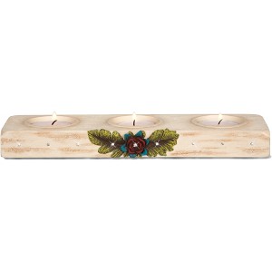 Triple candle holder, packaged in a printed box, is made from polyresin and fits 3 regular tealights (not included). Features a hand-painted floral design. Wipe clean only. Always take care around an open flame. Great for gifting to a friend.