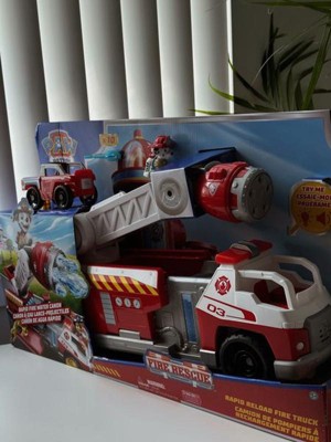 Get ready for thrilling rescue missions with the PAW Patrol Fire Rescue Rapid Reload firetruck. This Patrol Fire Rescue toy is a hero's dream, featuring a Marshall fire truck, a massive 20-inch-long patrol firetruck with lights, sound effects, a movable rescue ladder and an action figure. Kids can rotate the built-in projectile launcher on the fire engine to rapidly fire water projectiles, then drop the ladder back down for a quick reload so they can quickly launch 5 more, making every mission exciting. Open the truck walls to reveal a platform, rescue arm, and dual projectile launcher. Marshall Rescue is dressed in fire rescue gear and can be placed in the rear bucket, ready to drop into the mini rescue vehicle for quick action. Lower the rear door to launch the mini vehicle into thrilling adventures on rescue wheels. These PAW Patrol learning toys are PAWsome for a birthday, Christmas, or any holiday. For even more fun, combine with the Fire Rescue Command Center and six different Fire Rescue figures and action figure vehicles, so the excitement never ends. Relive cherished moments from past PAW Patrol Ultimate Rescue adventures and patrol fire stories, like the Mighty Pups, Aqua Pups, and PAW Patrol Movie, or create new adventures with a toy truck, a PAW Patrol tower, and individual PAW Patrol action figures and Marshall fire truck heroes. Your kids will love joining PAW Patrol Pups and the rest of the PAW Patrol Ultimate team on daring patrol fire rescue wheels. This fire engine playset inspires teamwork, imagination, and bravery in every adventure. Whether it's dousing flames or saving the day, Marshall fire truck toys deliver nonstop action with action figures, sounds, lights, and plenty of patrol fire excitement. Add the Marshall Rescue gear and patrol Mighty Pups lineup to your Marshall fire truck collection for even bigger missions and endless play. Includes: 1 Firetruck, 1 Figure, 10 Projectiles, 1 Mini Vehicle, 1 Heat Scanner, 1 Crane Arm