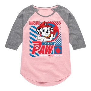 Paw Patrol - Team Paw Marshall - Toddler & Youth Girls Raglan Graphic T-Shirt - Join the Paw Patrol with graphic apparel that showcases your favorite pups—Chase, Marshall, Skye, and Rubble—ready to save Adventure Bay with their heroic adventures!