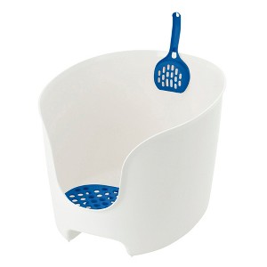 PAW TRAX HIGH WALL CAT LITTER BOX - WHITE & BLUE - Keeps litter and spray inside, where it belongs. The surrounded high wall is designed to prevent spills and litter scatter, ensuring a cleaner and more contained environment for both you and your cat. Plus, the Anti-Tracking Grate Step helps to remove litter from paws as your cat comes and goes and keeps litter off the floor. From kittens to senior cats, the top opening gives them quick and easy access, while the wall provides privacy to do their business. A bottom recessed handle allows you to lift the litter box easily for cleaning and relocating. A scoop is included and can be hung on a hook inside theLitter Boxfor convenient storage. The sleek shape design was created instead of an unwanted traditional litter box look.Recommended for cats up to 17.6lbs.