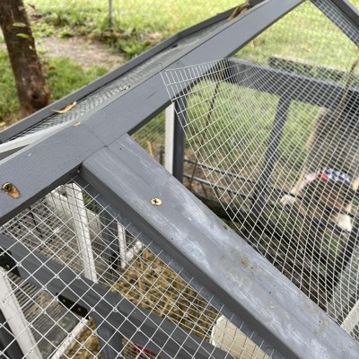 Easy assembling.. sturdy .. grey color is holding up to outside weather well... The only thing for me in using, the latches on the wire doors are a little difficult to get lined up to close.