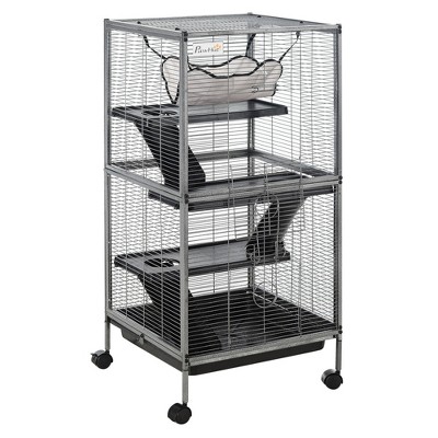 This PawHut rabbit cage is the perfect home for small animals like rabbits. This small animal cage features 4 wheels for easy moving from room to room and also provides a bit more height in order to easily view your pet. The durable design of this chinchilla cage features large doors for easy access. This animal cage also features a deep base to contain litter as well as a removable tray for easy cleaning up. The ramps and platforms to complete this cage, making it fun for your little friend.