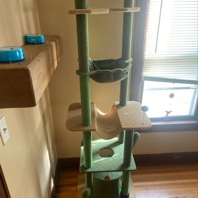 PawHut Floor to Ceiling Cat Tree, 89"-100" Adjustable Height Cat Climbing Tower for Indoor Cats w/ Grooming Brush Post, Cat Condo, Hammock, Green