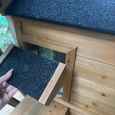 We have four feral cats we feed daily, and we thought the house might keep them comfortable during the upcoming winter. The house is made beautifully, easy to assemble by a single person, and it came with all the parts and screws it was supposed to come with. Recommend using a driver drill and a mallet to assemble. The only negative is that, despite the product description saying it's water resistant, the wood seems untreated and unfinished. If you put this thing outside without sanding and spraying, I think the elements would wear it down in a few years. Anyway, I customized mine with carpet squares inside for additional comfort. So now it's got different levels, with steps, all carpeted with pillows. You know, like ancient Egypt.