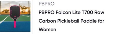 [This review was collected as part of a promotion.] Falcon lights T700 raw carbon pickleball paddle for women is awesome. Great quality easy to use very fun when playing awesome color everybody loves.