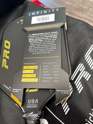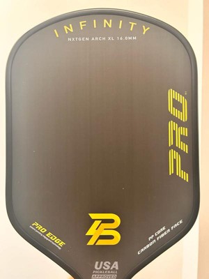 [This review was collected as part of a promotion.] The PBPRO Infinity NEXTGEN Arch XL 16.0 pickleball paddle is a high-performance option favored by intermediate to professional players. It features a polypropylene core paired with a raw carbon fiber face, providing exceptional durability, spin potential, and control. Key specs include a 16.4-inch length, 7.5-inch width, and 16mm thickness, with a weight of approximately 8.0 ounces. Its semi-rough surface enhances spin, while the balanced design offers improved handling and reduced vibration, which is helpful for players seeking control during dinks and resets  . I appreciate the paddle’s enlarged sweet spot and its ability to deliver both power and finesse. The grip is comfortable and anti-slip, adding to its playability. The design is sleek and very durable. .