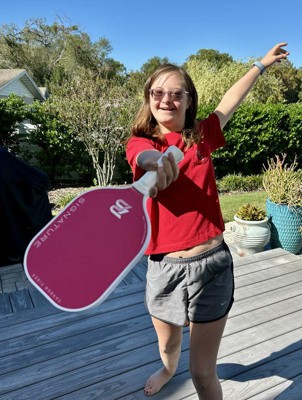 This is my favorite paddle! It's by far the best quality and still at a great price. Anyone who wants to step up their pickleball game needs it. Not only is the color super fun (and great for photos) but the grip is amazing. It genuinely elevates my game and makes me play better. I can't say enough good things. I play in a pickleball league at my school- and I bought my partner this paddle because she loved it so much. Whenever I wasn't using it she had to borrow. I love that it's carbon fiber, and has a slightly grainy texture that helps control the ball when it hits. Definetly recommend!