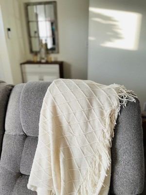 [This review was collected as part of a promotion.] Peace Nest diamond knit throw blanket is so soft and cozy. As soon as you wrap it around you, it feels warm and fuzzy. It can even be used as a shawl. The white color and the diamond pattern looks lovely on grey couch.