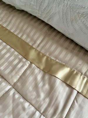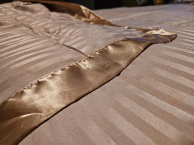 I really love this blanket! Not only is it pretty, it feels great also! The stripes with the satin trim remind me of the comforter in a nice hotel that I have stayed at. My husband is always hot at night and this blanket has been perfect as it doesn’t make him sweat but it is warm enough for me because I’m always cold. I’m definitely going to purchase another one for my guest room!