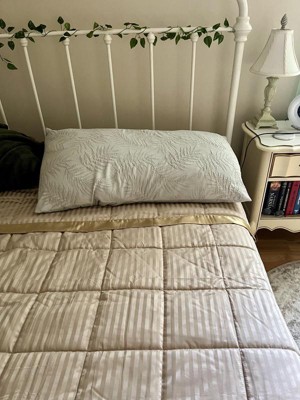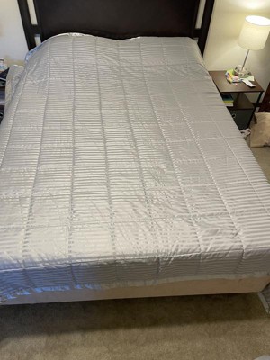 I really love this blanket! Not only is it pretty, it feels great also! The stripes with the satin trim remind me of the comforter in a nice hotel that I have stayed at. My husband is always hot at night and this blanket has been perfect as it doesn’t make him sweat but it is warm enough for me because I’m always cold. I’m definitely going to purchase another one for my guest room!