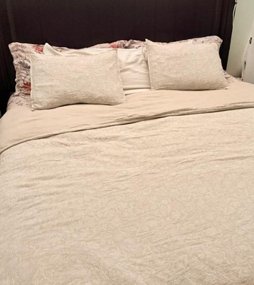 Bring natural charm and textured elegance to your bedroom with this floral jacquard duvet cover set. Crafted with a cotton-linen blend front (90% cotton, 10% linen) and a soft 100% cotton back, this set combines breathable comfort with a beautifully woven design. The front features a subtle yet detailed floral jacquard pattern that adds dimension and sophistication without overpowering your space. Built-in corner ties help keep your duvet insert securely in place for a neat, smooth bed all night long. Perfect for year-round use, this set includes a duvet cover and matching pillow shams, making it an easy upgrade for any bedroom style from rustic farmhouse to modern classic.