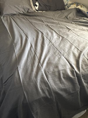 I love the color of this set. It’s such a pretty deep grey and looks so tailored and sophisticated. Out of the linen packaging the fabric was very soft, cool and almost silky. However, after one wash…. It came out feeling pretty scratchy. I am hoping after a few more washes it will soften up again.