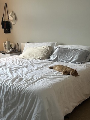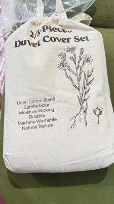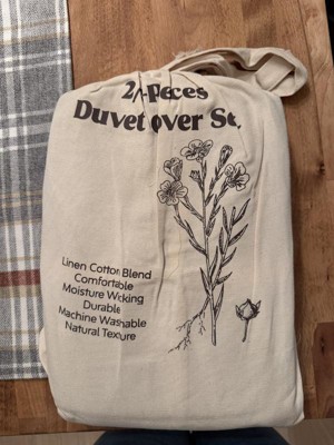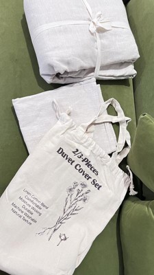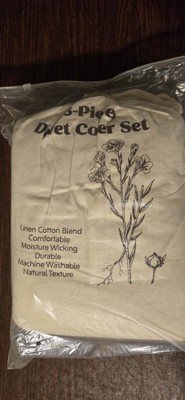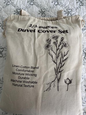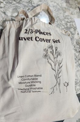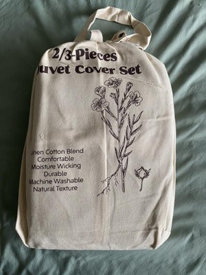 Upgrade your sleep with this premium flax linen and cotton duvet cover set, naturally breathable, moisture-wicking, and soft to the touch. The lightweight yet durable fabric ensures year-round comfort, cool and dry in summer, cozy in winter. Designed for everyday use, the duvet cover features a long hidden zipper and 4 corner ties to keep your insert securely in place. Pillow shams include envelope closures for quick and easy changes. Available in a range of solid colors, this set brings timeless elegance to any bedroom style. Machine washable. It also comes in a reusable canvas bag, making it easy to store or give as a thoughtful gift. Twin: 1 x Duvet Cover: 68x90" 1 x pillowcase: 20x26" Full/Queen: 1 x Duvet Cover: 90x90" 2 x pillowcase: 20x26" King: 1 x Duvet Cover: 106x90" 2 x pillowcase: 20x36"