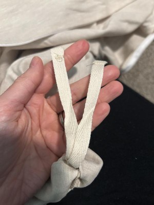 Feels like a good thickness and quality but not as soft as I like. It has ties in the corners but not anywhere in the middle. The zipper is hidden. It is a very neutral color not tan. I like the natural packaging without any unnecessary plastics, just a cotton bag and cotton ribbon and piece of cardboard. Will see how it holds up with washing.