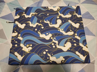 Very thick and absolutely love the design of rainbows. Very colorful and mainly blue with a little bit of white and dark blue also. Very stylish and so soft and firm at the same time to sit on and be relaxed.