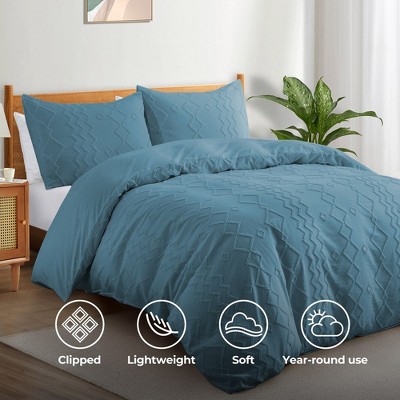 The tufted clipped jacquard designed duvet cover set with special geometric dimond pattern or wave pattern brings unique and stylish look to your bedroom, dressing up your comforter or duvet. Designed with a long zipper closure for convenience, it is easy and quick to use, also high quality zipper is sturdy and durable for a long-time use. The 4 corner ties inside of the duvet cover help to secure your duvet or down comforter in place to prevent it from curling up or slipping, making your night sleep more comfortable. Envelope closure pillow shams ensure that your pillows stay securely in place during the whole night. This thin lightweight duvet cover set with one duvet cover and two pillowcases(ONLY ONE pillowcase in Twin Size) is a perfect choice for you as it is suitable for all seasons.