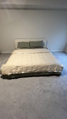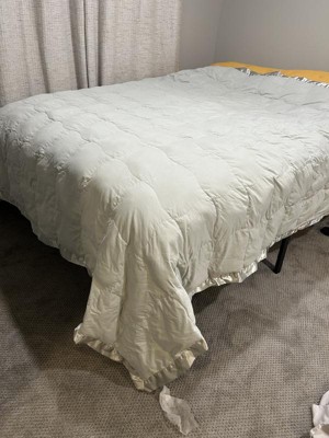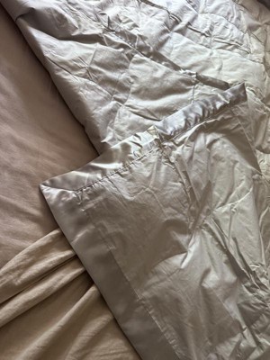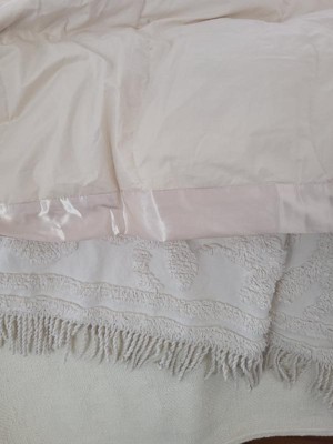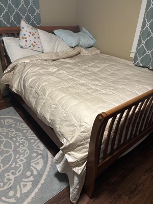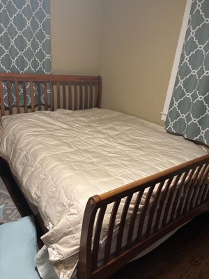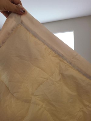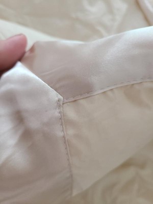 Nice light weight down comforter with a satin top all around. I don’t love the color as it is a more yellow-ivory instead of a classic khaki/tan. The satin trim is a nice touch and adds some elegance. Would purchase again in a different color. It is oversized on a double bed and fits a queen decently well.