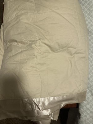 This blanket is wonderful. It is exactly what I was looking for, a thin, summer, down blanket. The "cover" is cotton but it feels like velvet! I got the Ivory color and it's perfect. The satin binding looked dark on my computer, but it's the same color as the blanket. I saw this exact blanket on 3 different sites for more $. I could not be happier!!!
