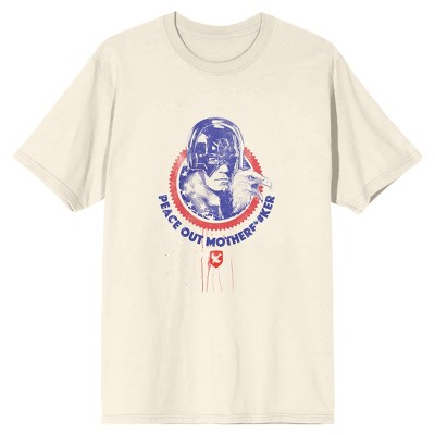 • GRAPHIC TEE: Christopher Smith and an eagle pose inside a round red blade on this graphic tee while blue letters under the image read, "Peace out motherf*#ker." Fans of the Peacemaker TV series will love this t-shirt.