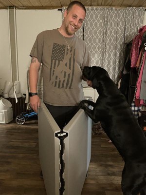 [This review was collected as part of a promotion.] We’ve had this table for about a month and a half and we love it! It’s easy to set up, break down and carry. It’s slim so it’s easy to store too! We have used it for cookouts, parties, even took it on vacation with us. I am in a wheelchair and I can easily roll under with enough room. I’m able to carry it with its comfy built in handle too! We are currently redoing our entire house and it has come in handy as an extra work space or even our dining room table! It is husband and dog approved too!!