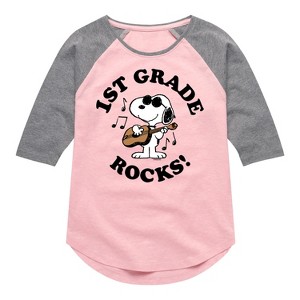 Peanuts - 1st Grade Rocks - Toddler And Youth Girls Raglan Graphic T-Shirt - From the best-loved comic strip in history comes officially licensed PEANUTS apparel for fans everywhere. Show your love for Charlie Brown, Snoopy, Woodstock, Lucy, Linus, Pigpen and the whole gang. Copyright Peanuts.