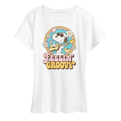 Peanuts - Feelin Groovy Snoopy And Woodstock - Women's Short Sleeve Graphic T-Shirt - From the best-loved comic strip in history comes officially licensed PEANUTS apparel for fans everywhere. Show your love for Charlie Brown, Snoopy, Woodstock, Lucy, Linus, Pigpen and the whole gang. Copyright Peanuts.