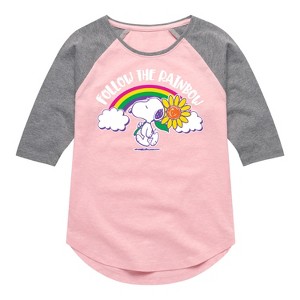 Peanuts - Follow The Rainbow - Youth Girls Raglan Tee - From the best-loved comic strip in history comes officially licensed PEANUTS apparel for fans everywhere. Show your love for Charlie Brown, Snoopy, Woodstock, Lucy, Linus, Pigpen and the whole gang. Copyright Peanuts.